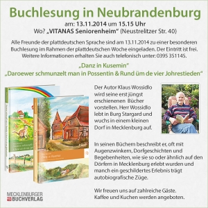 Lesung zu den Büchern „Danz in Kusemin“ und „Daroewer schmunzelt man in Possentin & Rund üm de vier Johrestieden“ von Klaus Wossidlo in Neubrandenburg (15:15 Uhr - Seniorenanlage) im Rahmen der plattdeutschen Woche